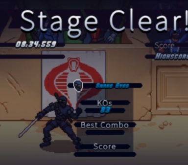 (I can’t vouch for how well the presentation fits the G.I. Joe vibe, but it’s adequately retro… right up until the Game Over or Stage Clear screen hits you with default Windows-ass fonts next to the stylised pixel italics)