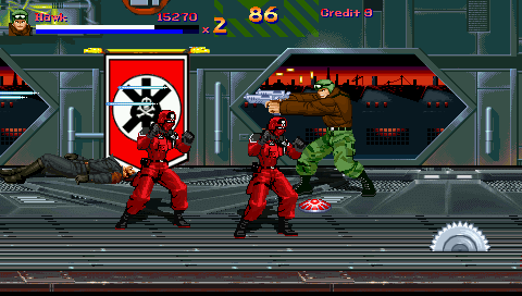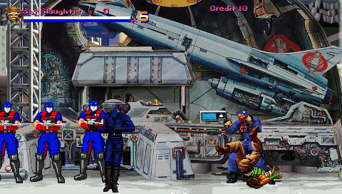 Street Fighter Alpha‘s Guile has been edited to make up three of the four player characters, with dodgy new hats and camo patterns to set them apart. It looks like Marvel vs. Capcom‘s Cyclops was modified to Snake Eyes, and a bevy of other familiar faces make up the other Joe and Cobra forces, including KOF‘s Heidern as Cobra Commander with a dashing dab attack.