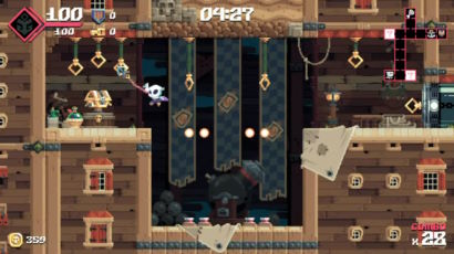 A room-based 2D platformer here you jump, shoot, and explore enemy ships for treasure and bonus, using the titular tool to propel yourself towards hooks and anchors. Your ultimate goal in each level is the big treasure chest, framed as holding coordinates to the bounty you’re hunting; run through a few maps, challenge the boss ship, and then do it again on the next ‘world’.