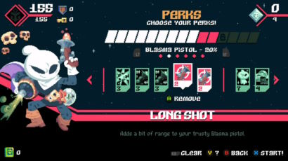 Perks can be equipped for a variety of benefits: increasing your maximum HP or how much XP or gold you acquire, as well as change the properties of your gun or other passive traits. It’s similar to Paper Mario‘s Badge system in that each Perk has a different cost, and you only have so many points to allocate (you can increase your maximum at a cost in the upgrade shop), so it’s weighing up what you want versus what you can afford…