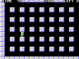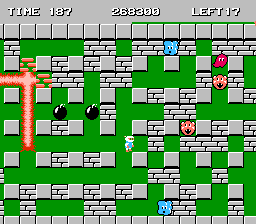 A debug mode of sorts exists across several versions, marking the location of the exit door and item by showing the soft blocks containing them as partially damaged. Changing address 0094 (NES) or D011 (MSX) to a non-zero value will activate it. Certain passwords can potentially trigger it as well. Kudos to The Cutting Room Floor and MGN3303 for discovery.