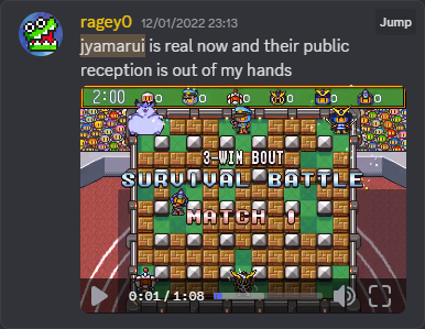 (this is in reference to a crass in-joke in the Power Bomberman Discord that jyamarui unfortunately resembles by shape and colour. unintentional! no relation!)